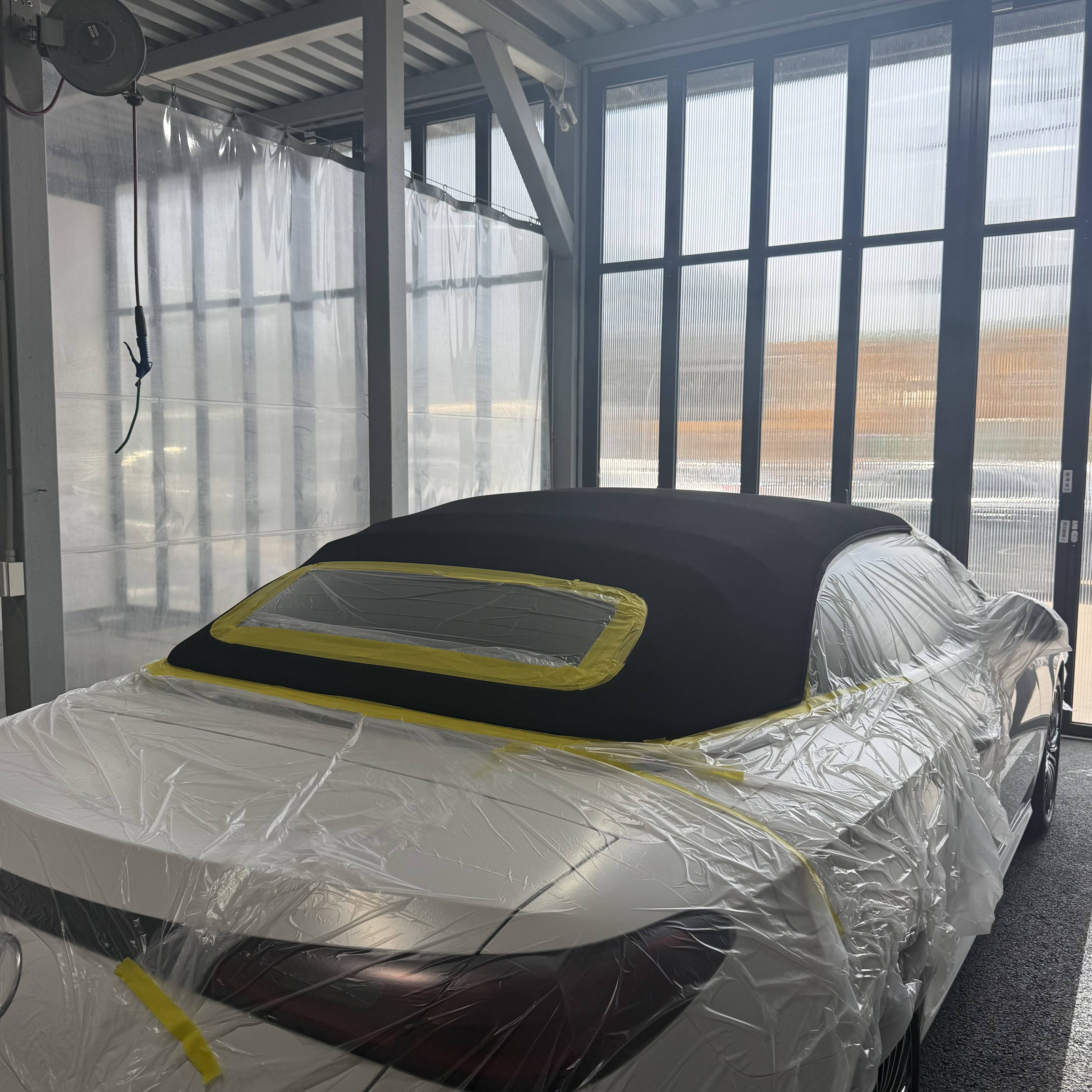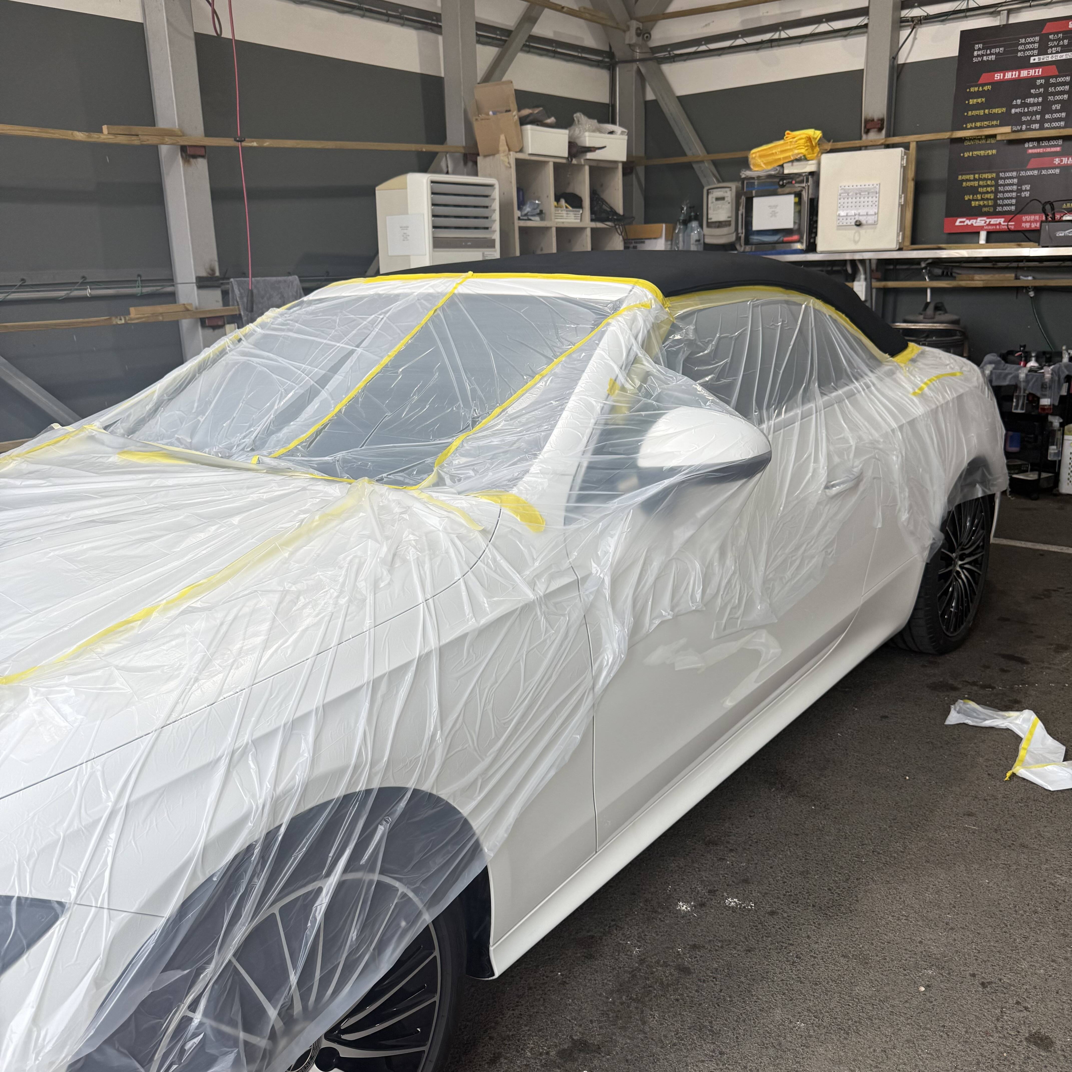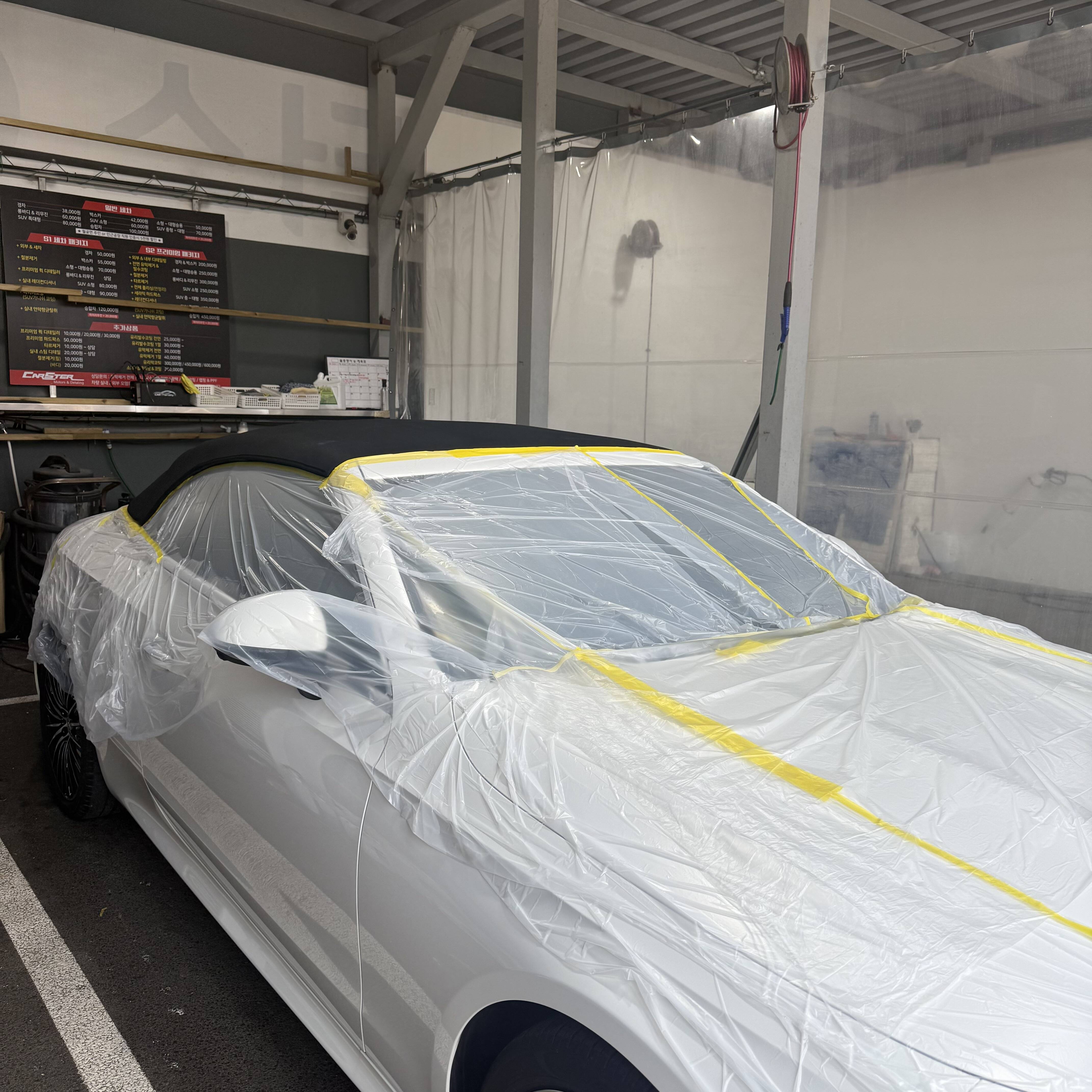 소프트탑 코팅 진행 전 도장면에 약품이 묻는것을 방지하기위하여 마스킹을 완벽하게 진행합니다 . 저가형 마스킹테이프가 아닌 실제 저희공장에서 도장 진행시 사용하는 마스킹테이프로 진행!