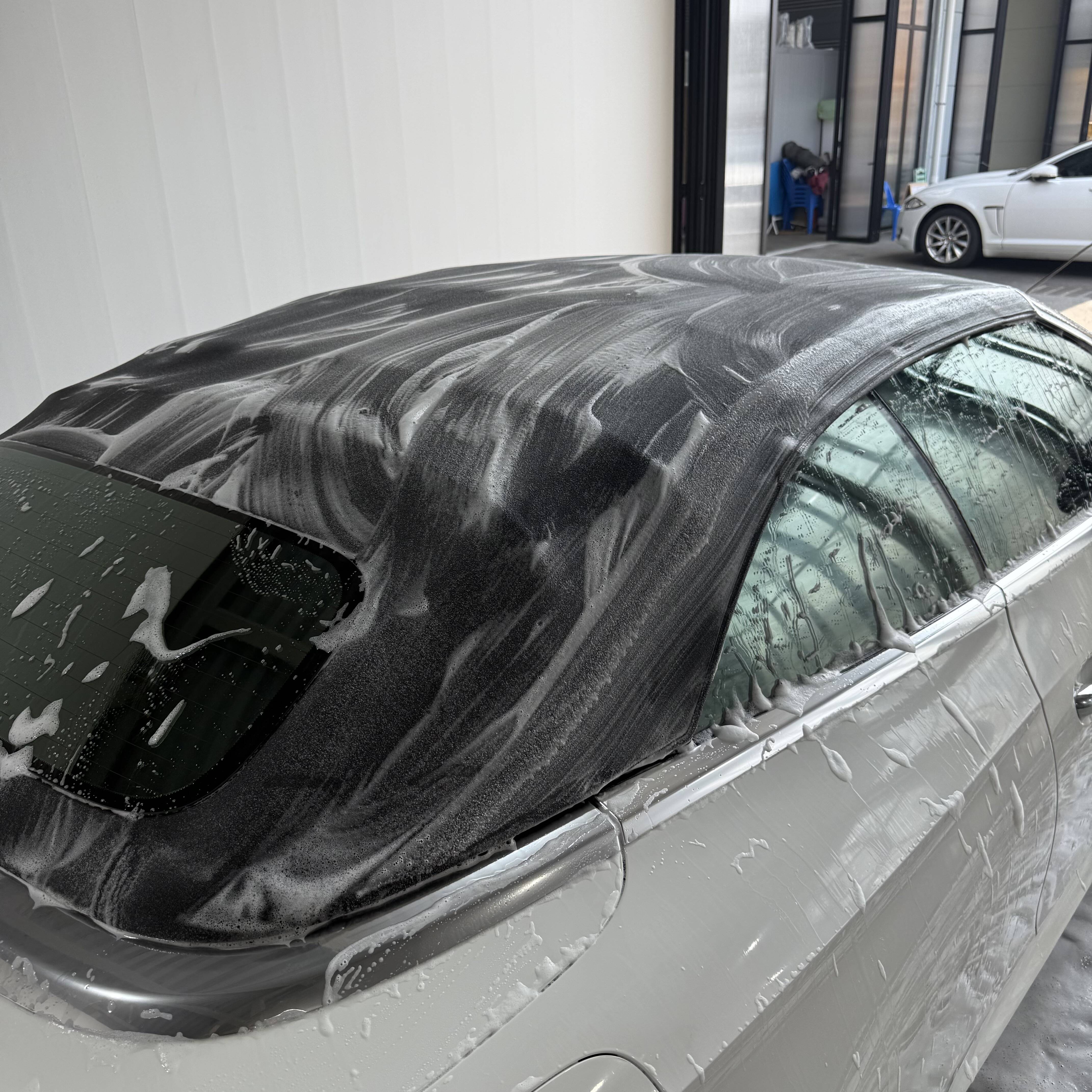 소프트탑의 경우 부드러운 미트 및 디테일링 붓으로 세차를 진행합니다.