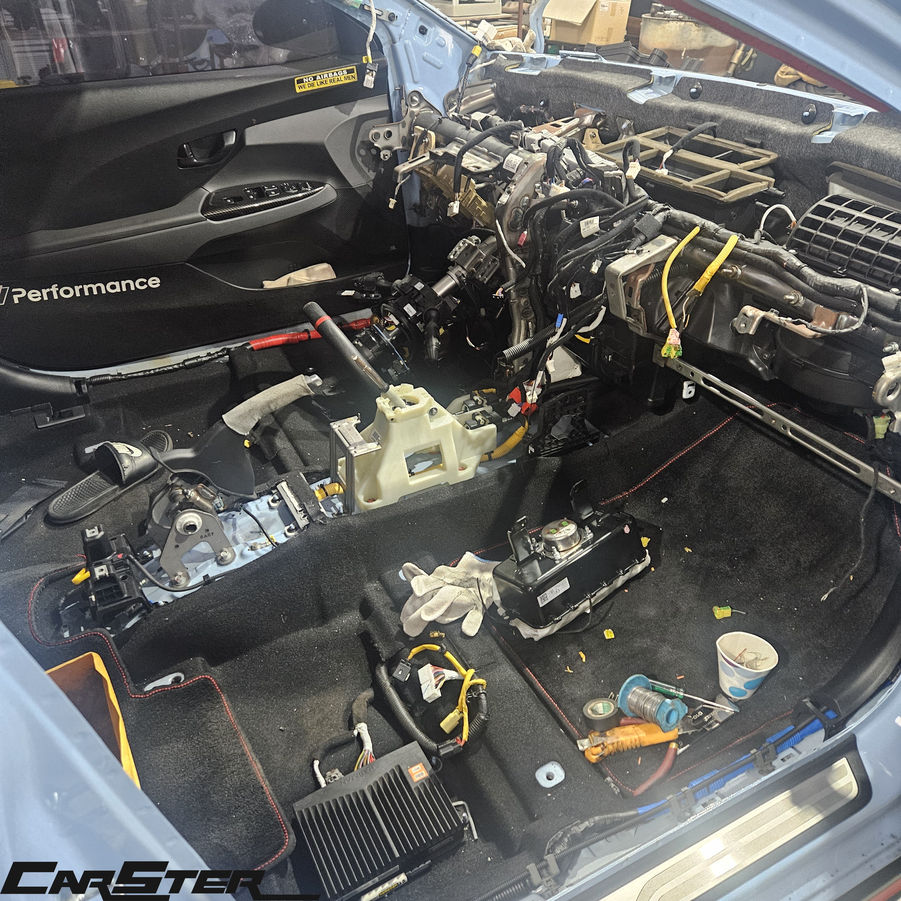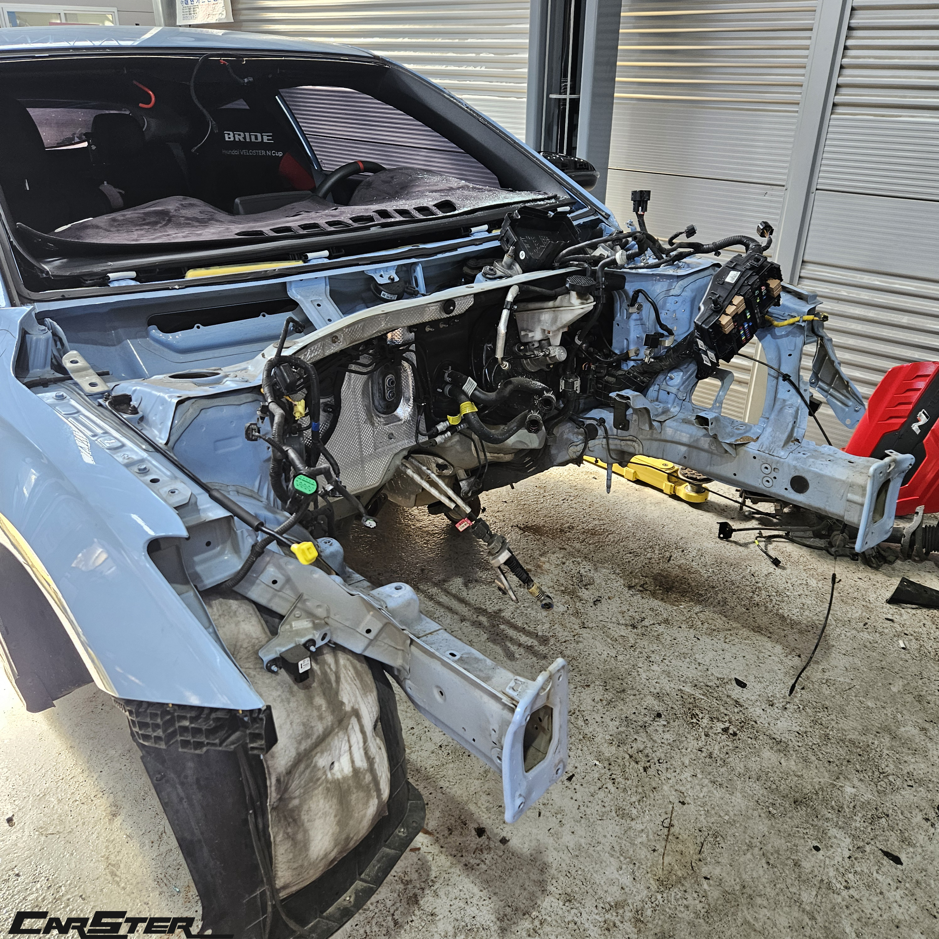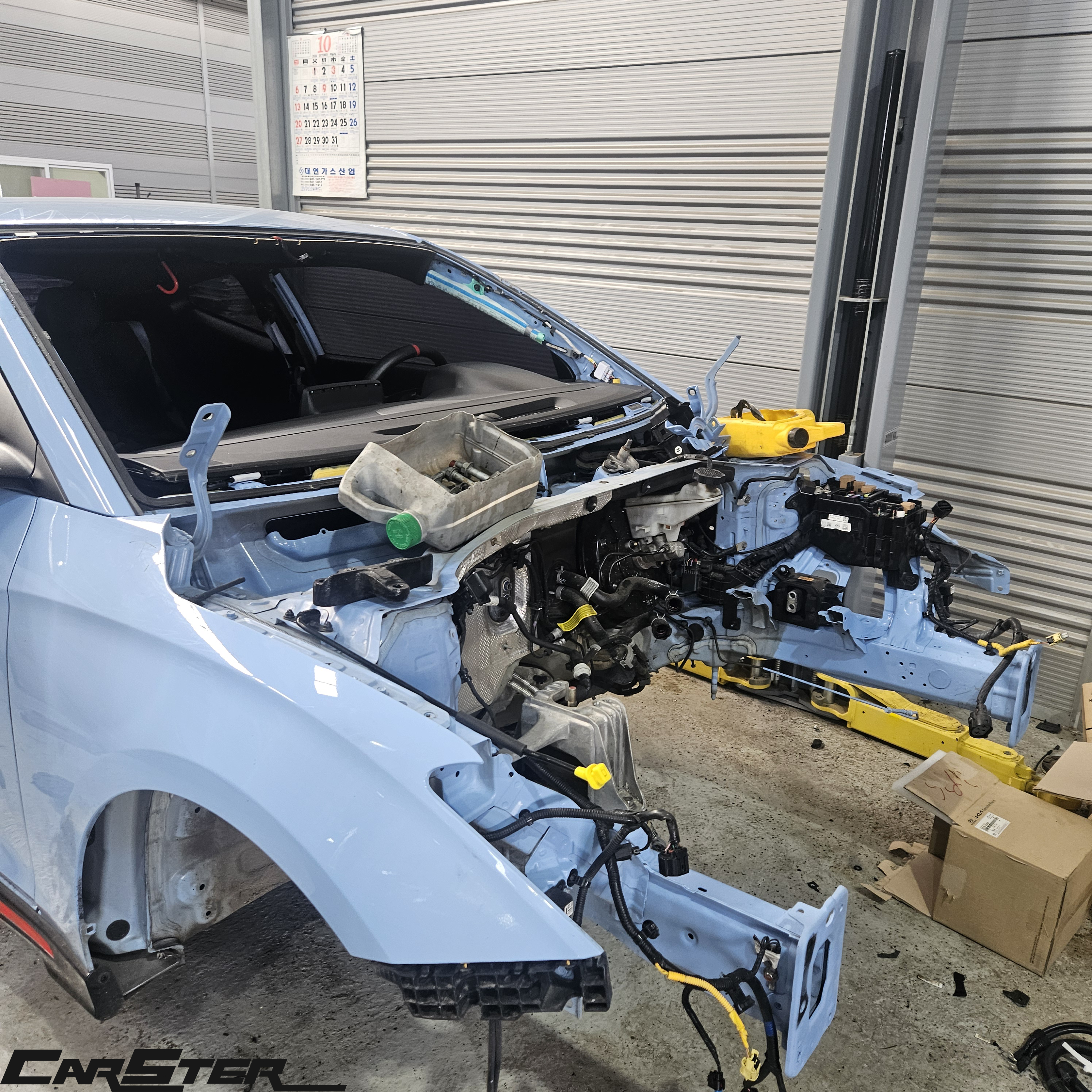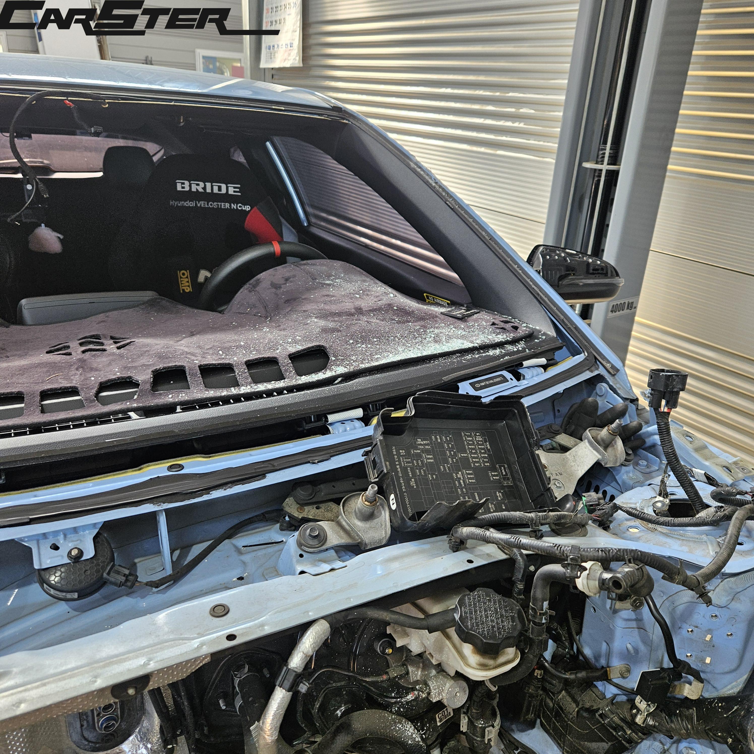 엔진 탈거 및 수리과정 사진입니다 . 유리를 탈착한 후 보시면 유리가 깨지며 실내까지 모두 파편이 튄걸 보실 수 있으십니다 . 이런경우 카스터는 디테일링샵까지 모두 한곳에서 운영하기에